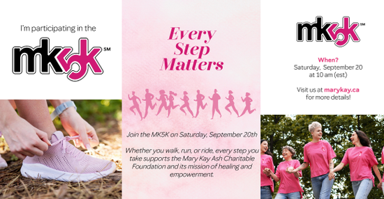 Whether you walk, run or ride, join the Mary Kay Canada Team on Saturday, September 20 at 10 am (local time!) for an in person MK5K in support of the Mary Kay Ash Charitable Foundation! Join a community of go-givers on a mission to bring hope and light to women facing cancer and women and children impacted by domestic abuse.
