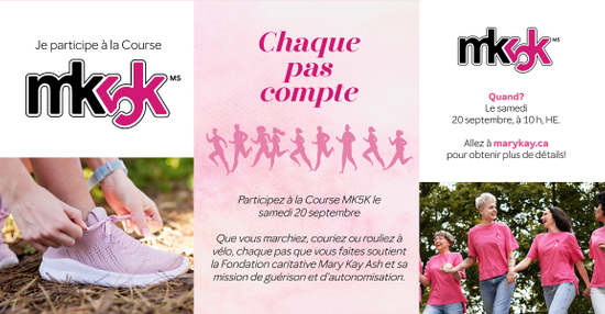 Que vous optiez pour la course à pied, la marche ou le vélo, joignez-vous à l’équipe de Mary Kay Canada le samedi 20 septembre à 10 h (heure locale!) pour leur course MK5K en personne au profit de la Fondation caritative Mary Kay Ash! Rejoignez une communauté virtuelle de personnes d’action qui a pour mission de donner de l’espoir aux femmes atteintes de cancer, et aux femmes et enfants victimes de violence familiale.